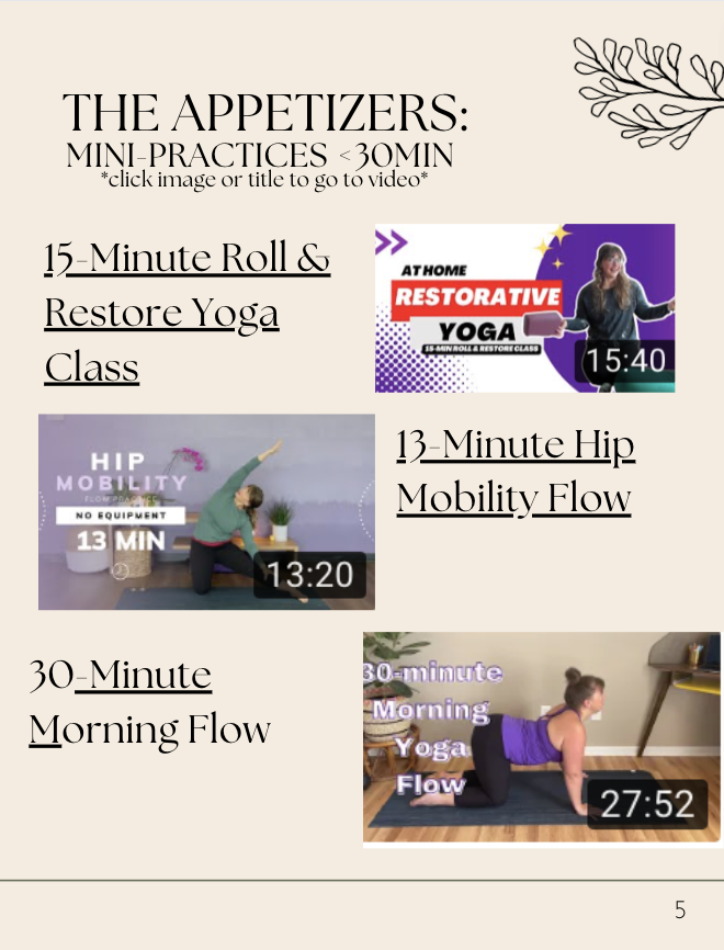 Next you get three movement appetizers to choose from when you want a short practice. These practices range from chair yoga to a gentle mat-based class. No props needed for these other than a chair for the chair yoga classes.Â